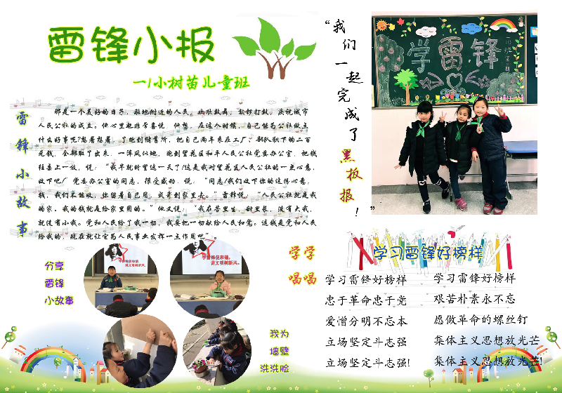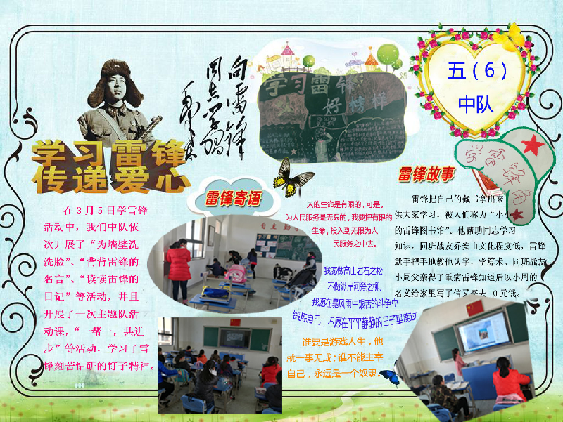 学雷锋活动重在行动,3月6日中午我校全体红绿领巾开展了“我为墙壁洗洗脸”活动;三至九年级的志愿者服务队在大队部提供的“菜单”中主动为学校专用教室进行了卫生打扫、物件整理等服务;中队开设学雷锋好事角,学习雷锋助人为乐的精神,自觉为学校、班级、父母、师长、伙伴做好事;学习上开展“一帮一,共进步”活动,学习雷锋刻苦钻研的钉子精神,倡导优秀学生帮助学习上有困难的学生。最后各中队将本月中开展的雷锋活动通过电子小报的形式进行总结。
