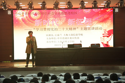2023年4月4日下午,上海市博文学校中学部学生开展了“习近平新时代中国特色社会主义思想进校园”主题宣讲活动,三百多名学生在学校多功能厅参加了“春语”青教宣讲团成员、工商信息学校党总支书记王春兰的题为《新时代 新征程》的宣讲会。